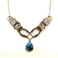 Solid sterling silver featuring etched copper abstract stag beetles and a dangling Teardrop turquoise gemstone