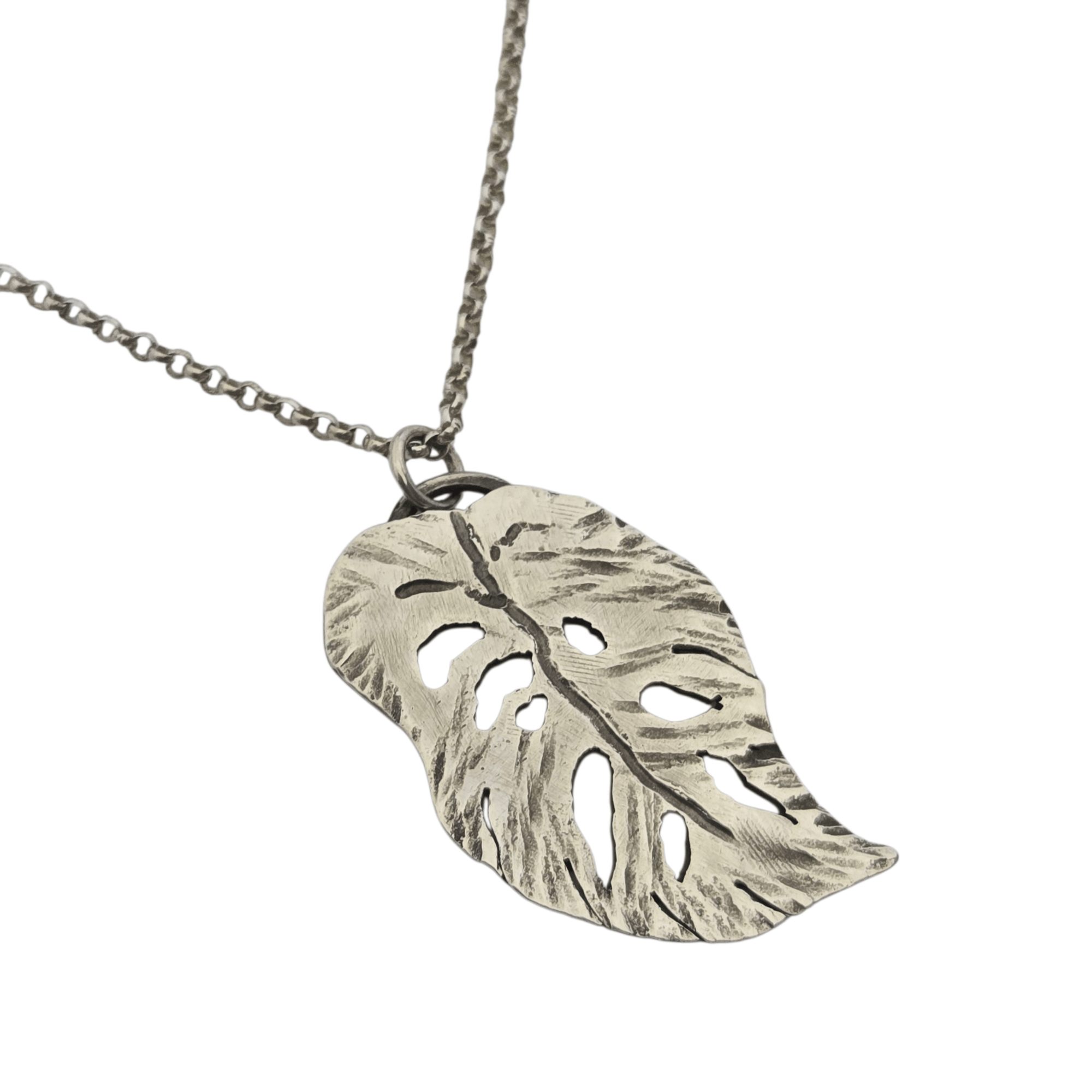 Hand cut Monstera Adansonii plant leaf pendant in solid sterling silver
